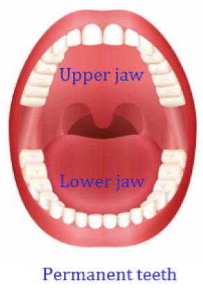 As the milk teeth fall, they are slowly replaced by new permanent teeth. The permanent teeth are the second set of teeth. There are 32 teeth in the permanent set, 16 teeth in each jaw.